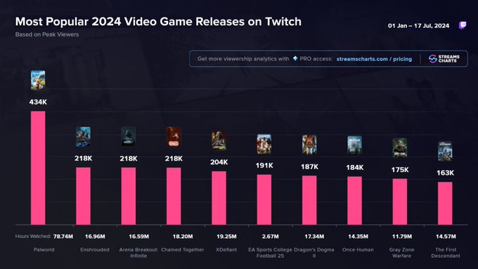 2024.07.22 お知らせ 『Palworld / パルワールド』が2024年Twitchで最も視聴されたゲームに選出 2024年にリリースされたタイトルで最も多くの同時視聴を集めたランキング(2024年7月17日時点)で『Palworld / パルワールド』が1位となりました。総視聴時間は7,874万時間となっています。たくさんの方々に楽しんでいただき、ありがとうございます。これからも開発チーム一同、全力で取り組んでまいります。 シェアする ページ送り 一覧に戻る 前の記事へ 次の記事へ
